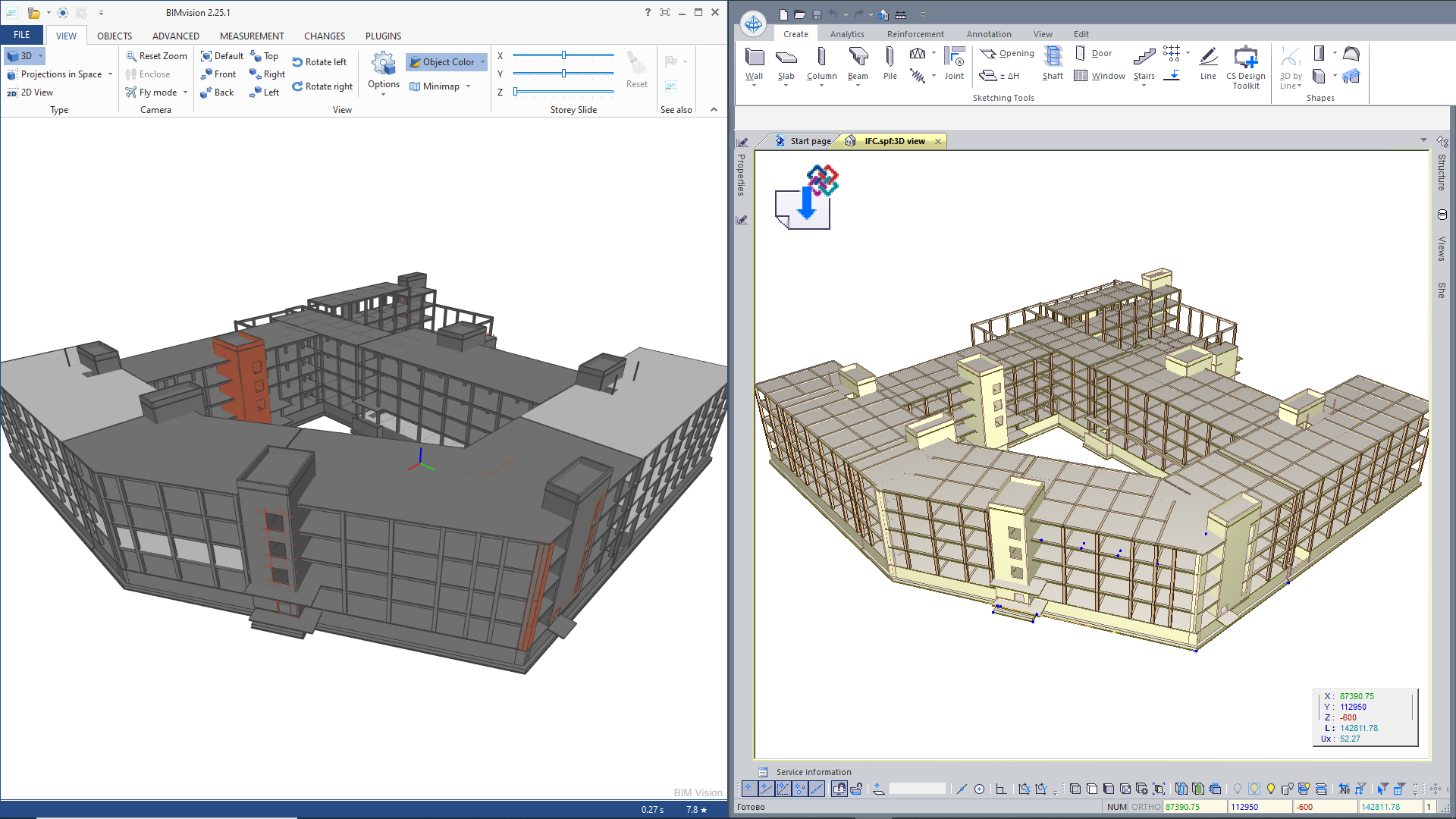 Design model is generated according to the architectural model in terms of analytical concepts. BIM technology in LIRA-FEM helps engineers minimize the number of errors due to repeated data entry, improve efficiency of collaboration between related departments, coordinate design activities and reduce time losses.
