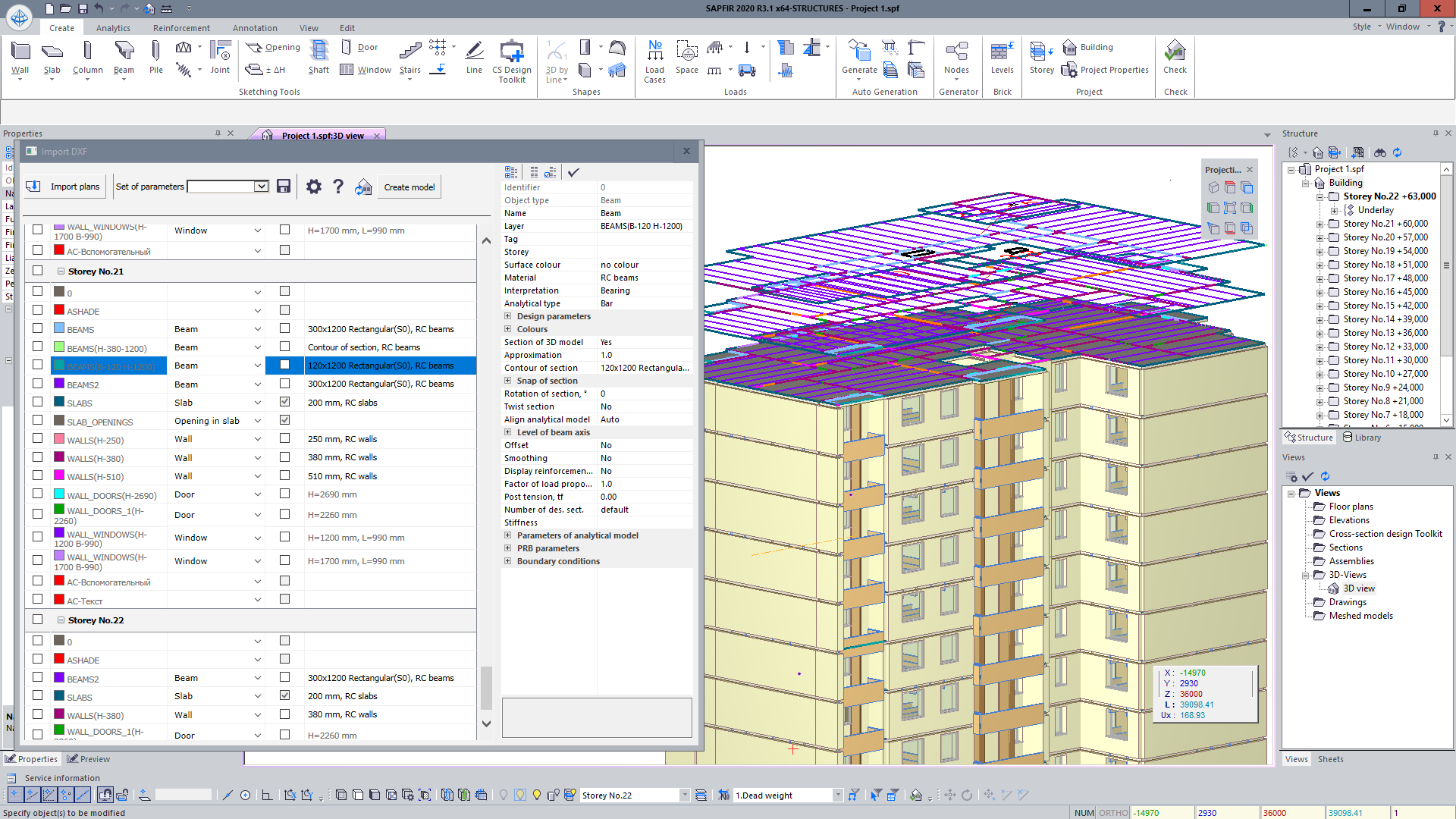 Floor plans are imported into LIRA-CAD. Each layer is assigned the type of object that this layer will create in LIRA-CAD. You can obtain sections and thicknesses of elements from the DWG file if the objects were generated along the contour. It is also possible to assign these parameters directly during the import to LIRA-CAD.
