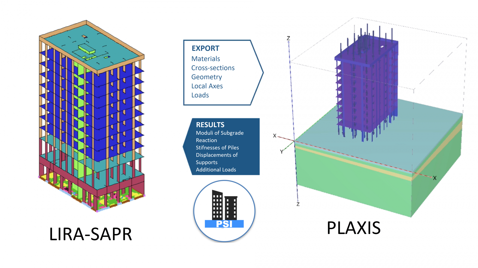 Integration with Plaxis via IFC and DXF file; Integration between LIRA-FEM and Plaxis via PSI (Plaxis Structure Interaction); Generation of the meshed model from IFC file; Option to transfer model to VISOR to be analysed; Generation of soil model in Plaxis; Work with PSI; Results in program Output; Import of file from Output to VISOR; Compare C1, C2 and transfer from file to file; Examples of real objects