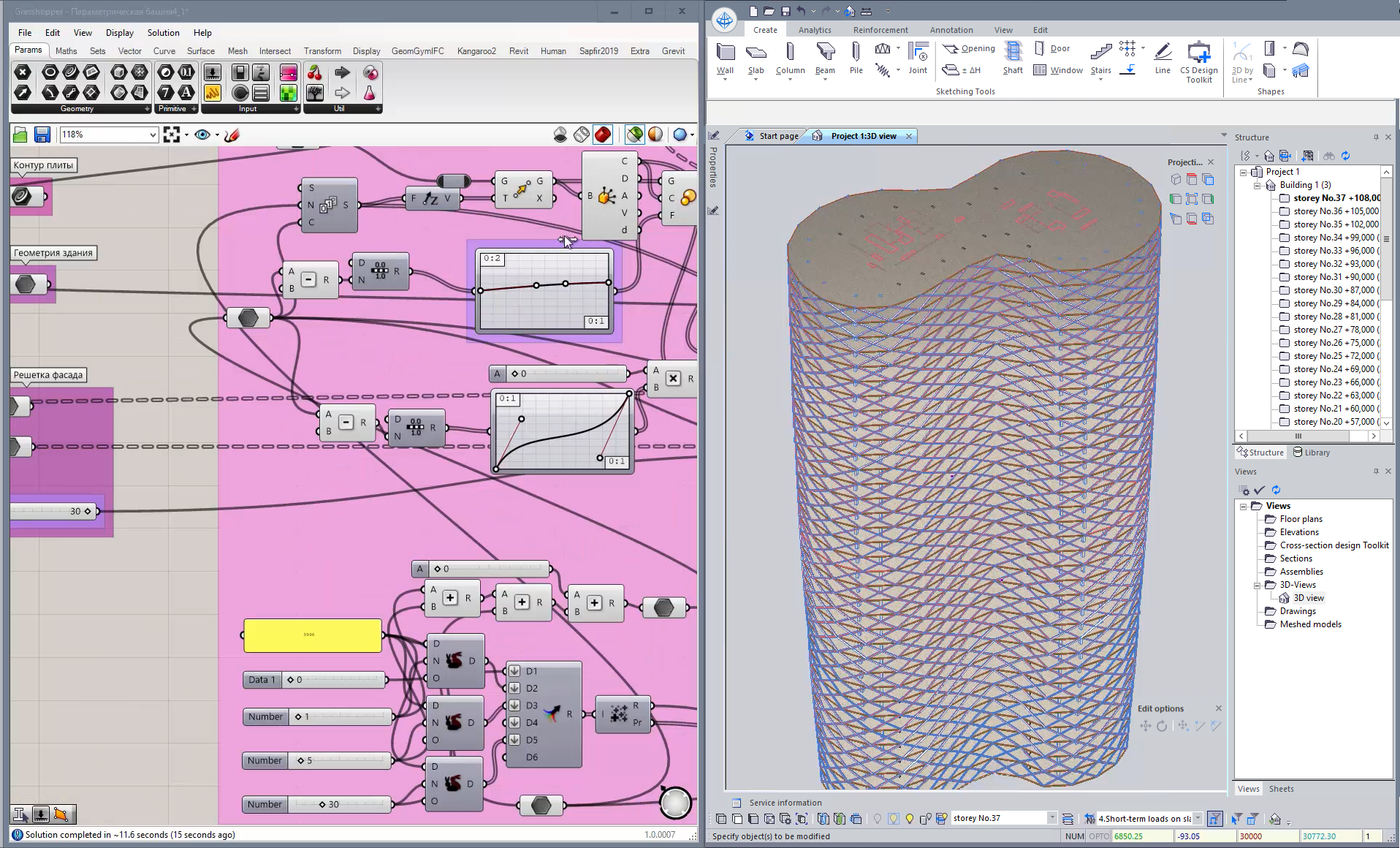 Rhino / Grasshopper and LIRA-CAD may communicate directly through this plugin to generate and manage the BIM model in the Grasshopper visual programming interface. As the integration procedure is associative, it enables the user to generate models of different complexity. When the algorithm in Grasshopper is modified, the model in LIRA-CAD is dynamically modified as well as the meshed model.