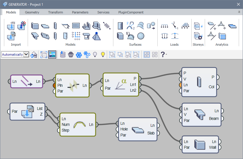 The user interface of Generator consists of ribbon and working area – canvas where graphic sequence of actions is generated. The nodes' palette is divided into tabs by thematic focus: models, geometry, transformations, parameters and services.
