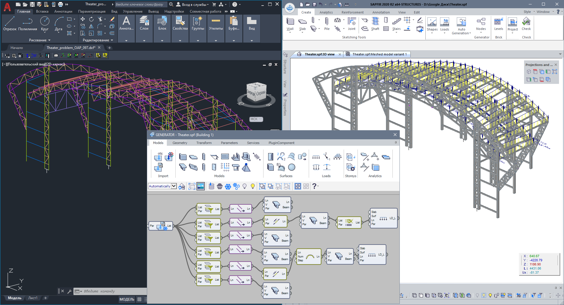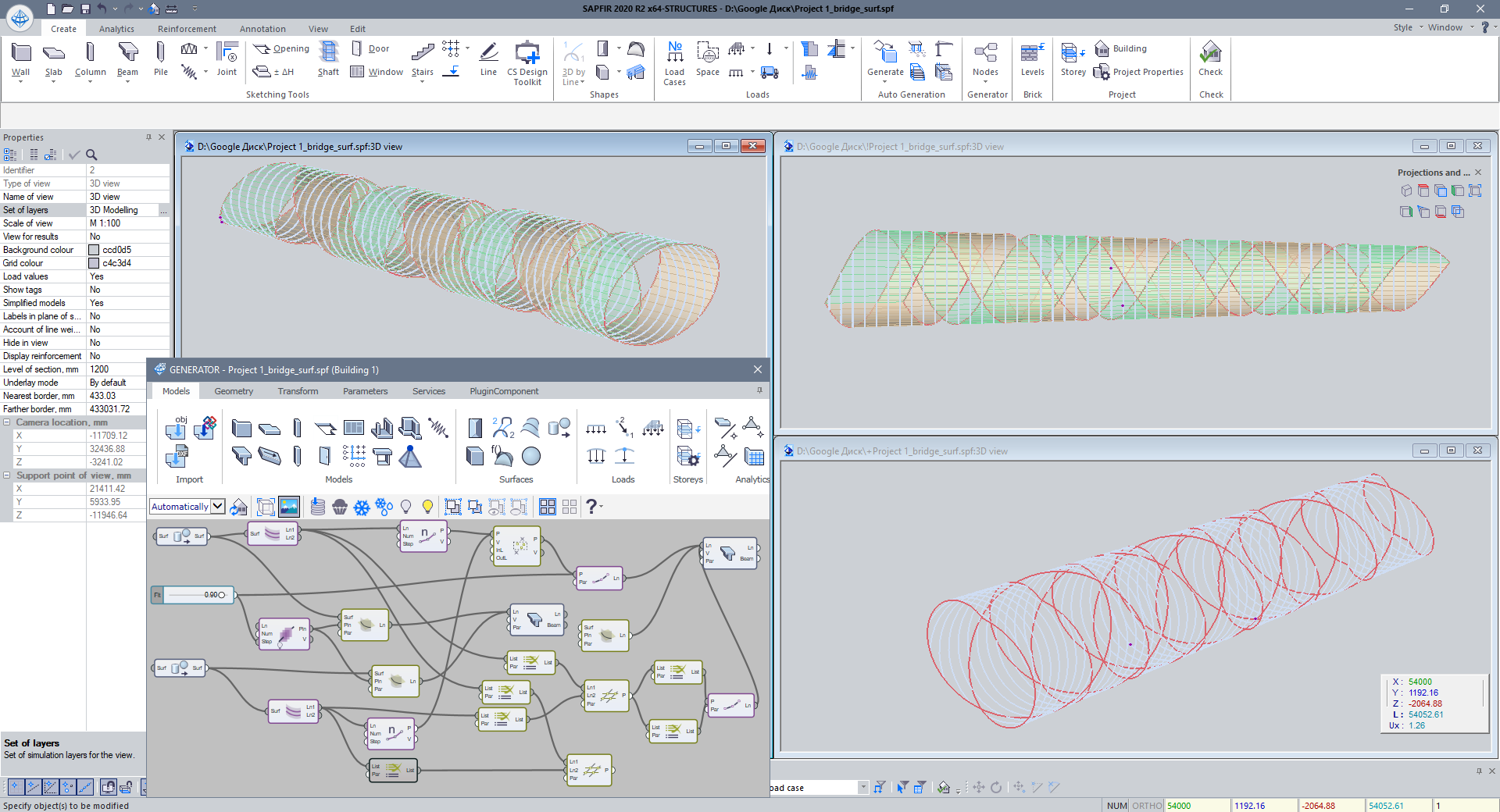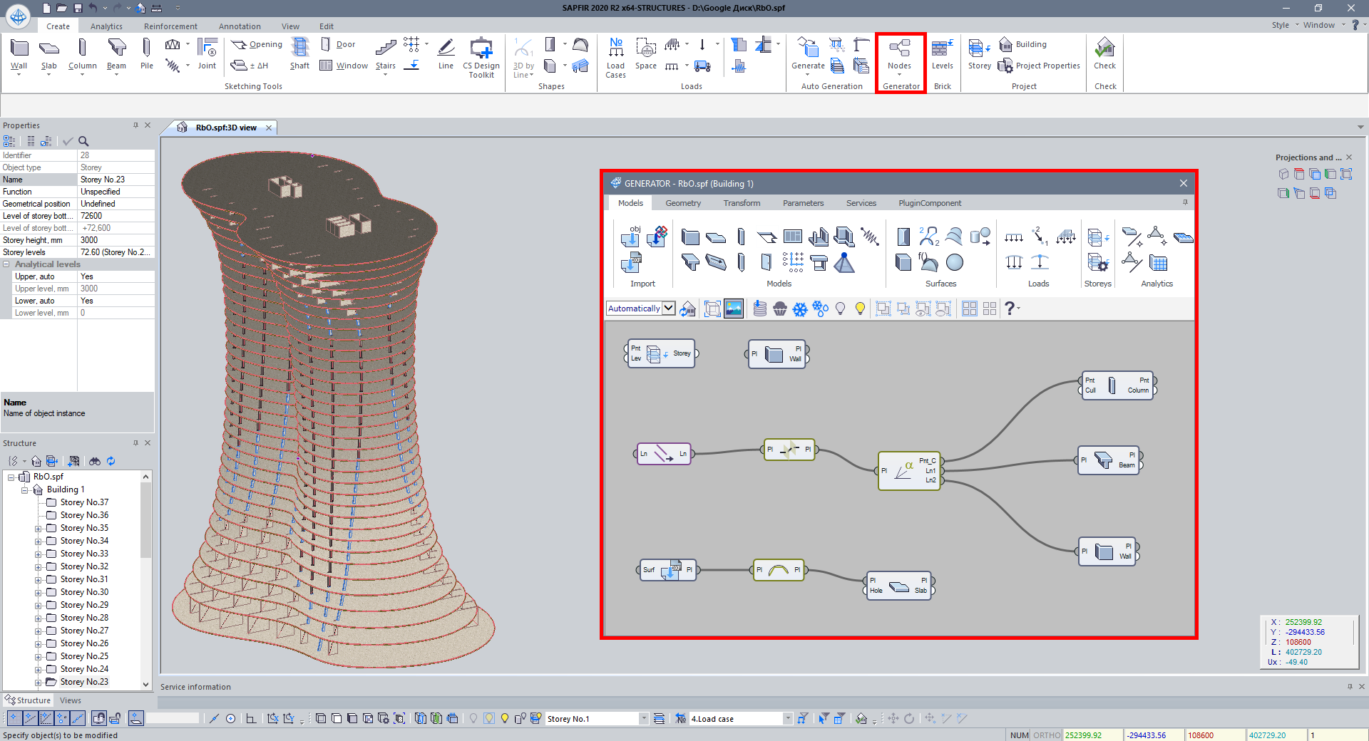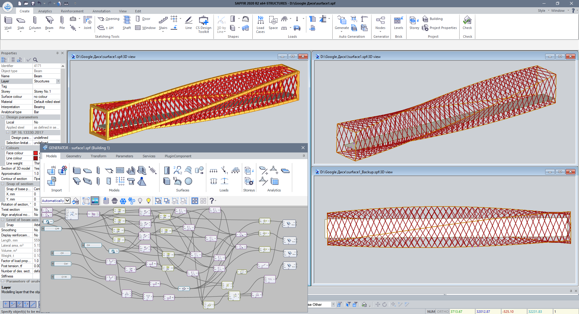 This module provides the ready 3D model that consists of basic objects presented in LIRA-CAD: columns, beams, walls, slabs, piles, trusses, surfaces, loads, boundary conditions, etc. Generator together with LIRA-CAD enables us to use precise parametric test over the model and then export it to LIRA-FEM for further analysis.