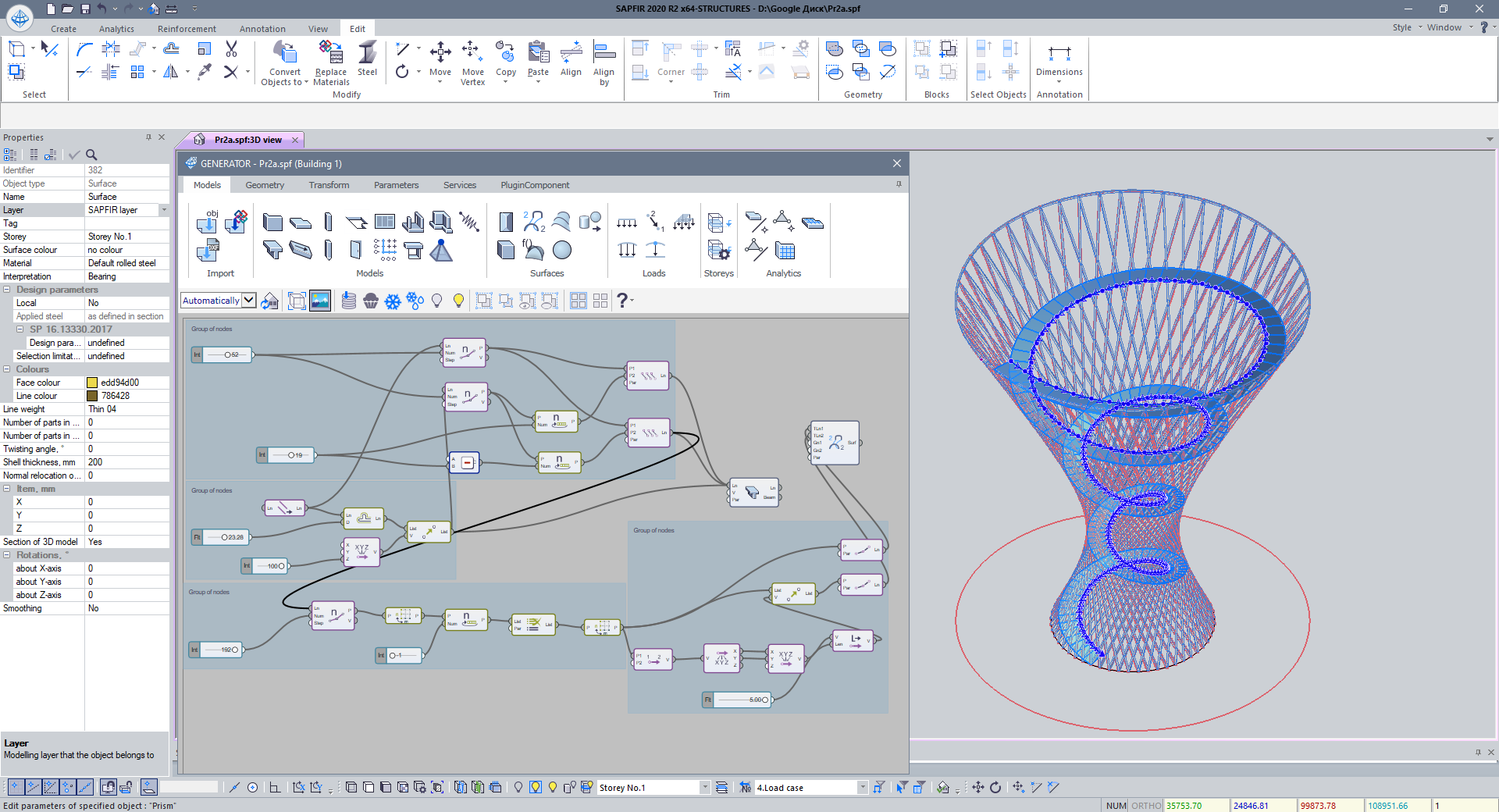 Flexible tool in the BIM chain. It enables the user to model (parametrically) buildings and structures of arbitrary shape. This module presents advanced technologies for generating models of structures. This is graphic editor for algorithms (sequence of actions); this editor applies modelling tools available in LIRA-CAD.