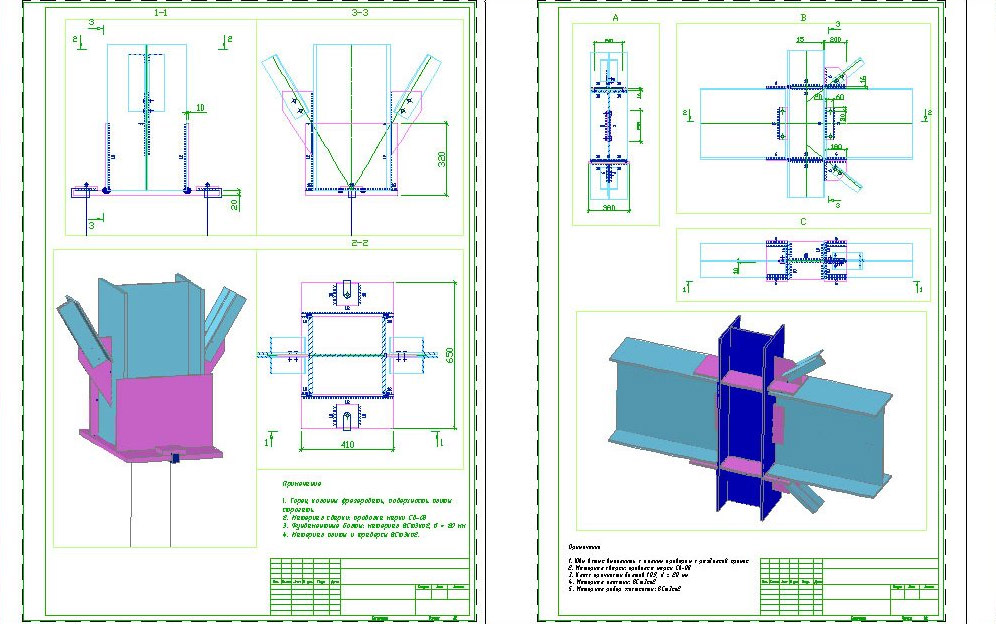 According to the data imported from VISOR module (design model, analysed and unified element sections, analysed and unified joints), design model is generated as well as lists of elements, drawings of joints, necessary notes, specifications. The user could make layout of drawings, arrange model presentations, separate items, tables and notes on the sheets of drawings.