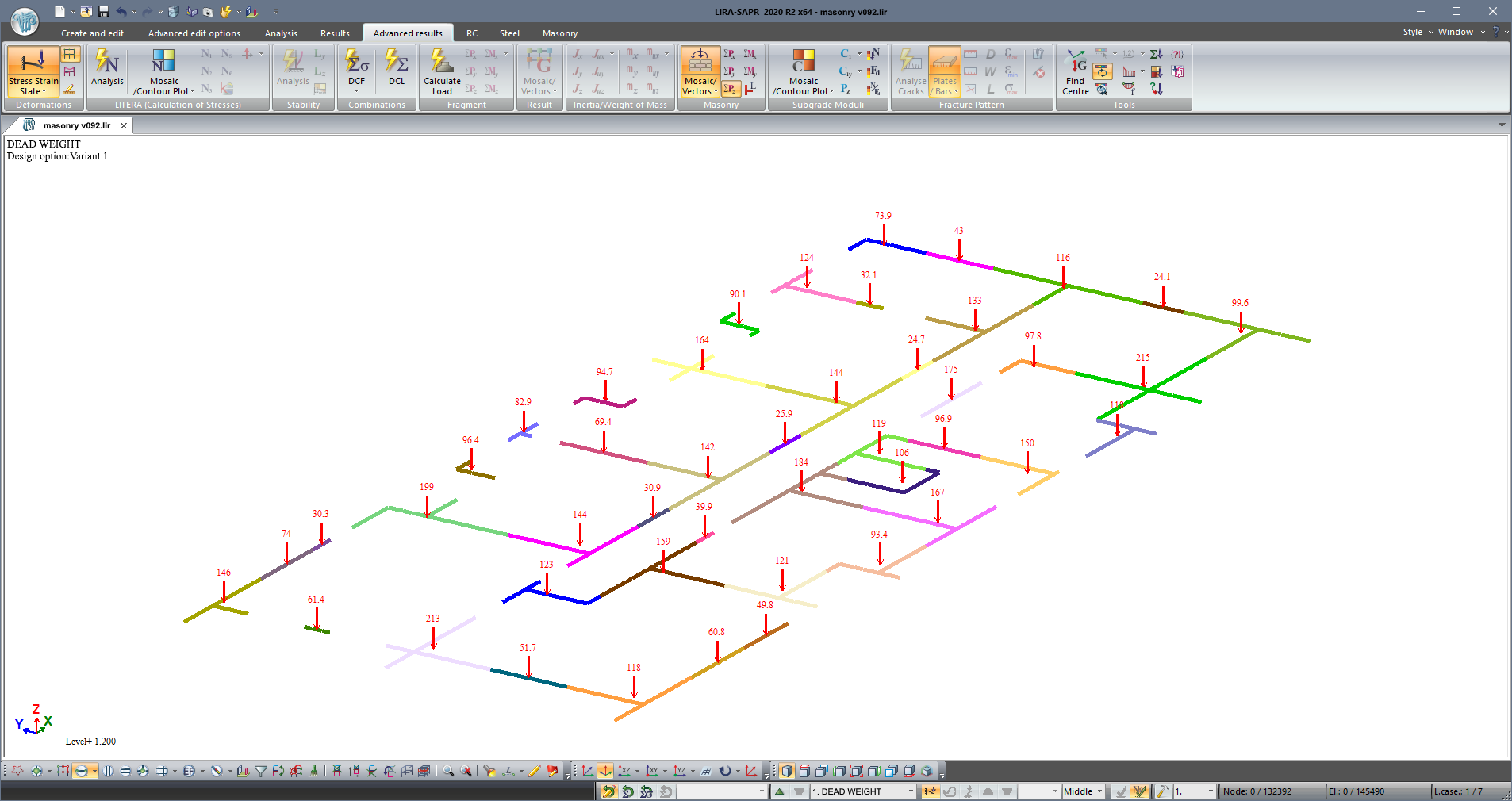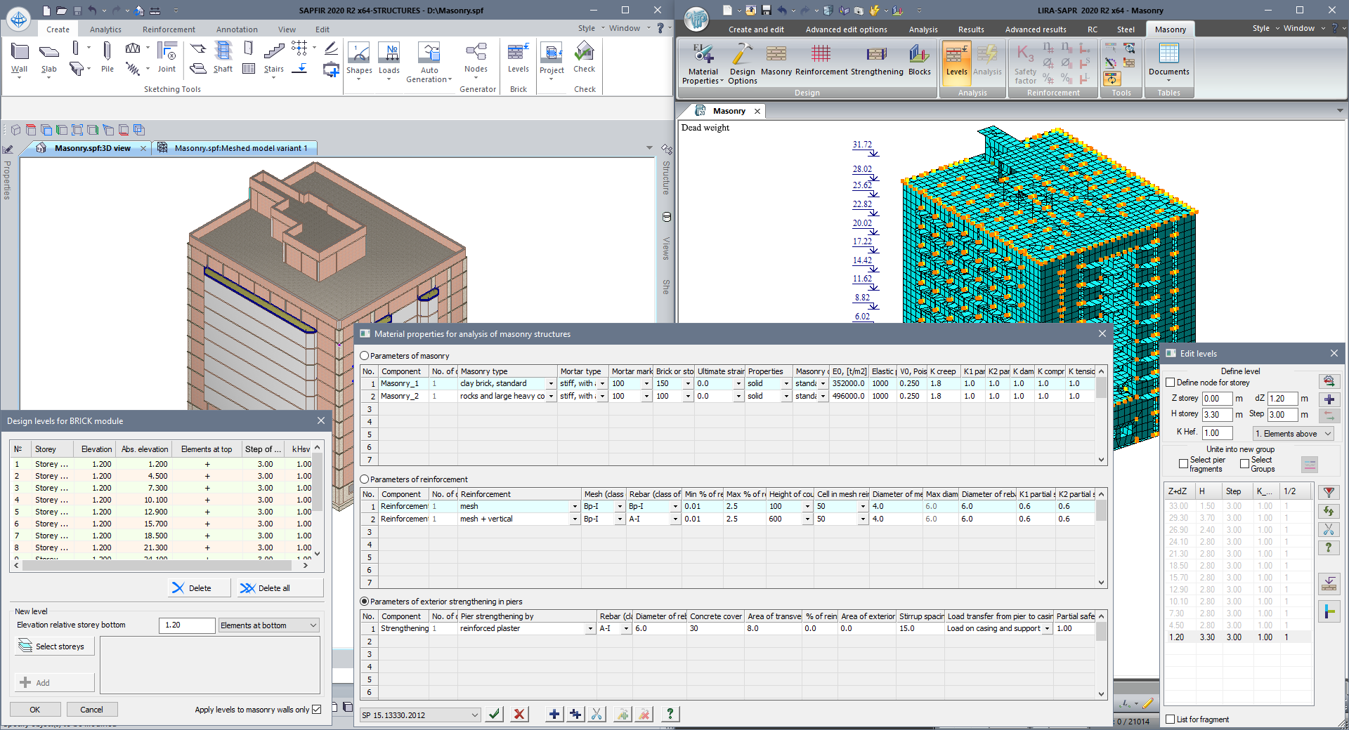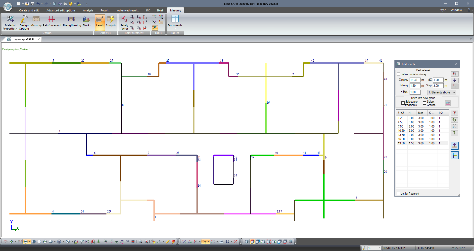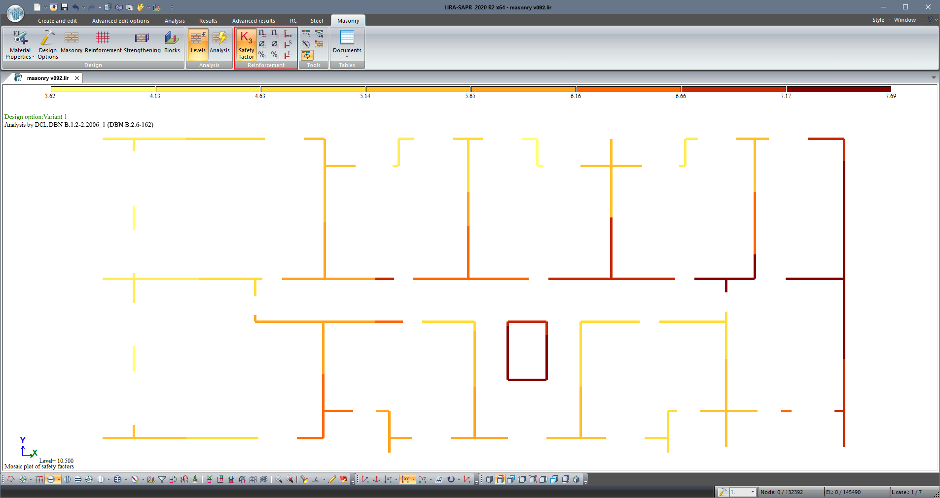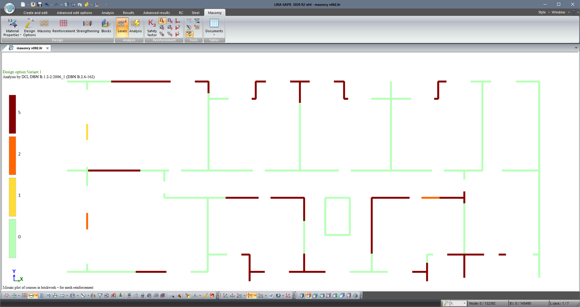 The model is generated in graphic environment VISOR or in LIRA-CAD. The user assigns horizontal levels in structural model (at the elevation of min section of pier, at elevation where floor slabs are supported, etc.), the strength of masonry is checked at these levels. When forces are computed by the solver, combined 3D behaviour of load-bearing brick and reinforced concrete elements of the building is considered. Required number of mesh reinforcement as well as rebars of vertical reinforcement is determined. It is possible to analyse several variants for different division of wall segments in different design options defined by the user.