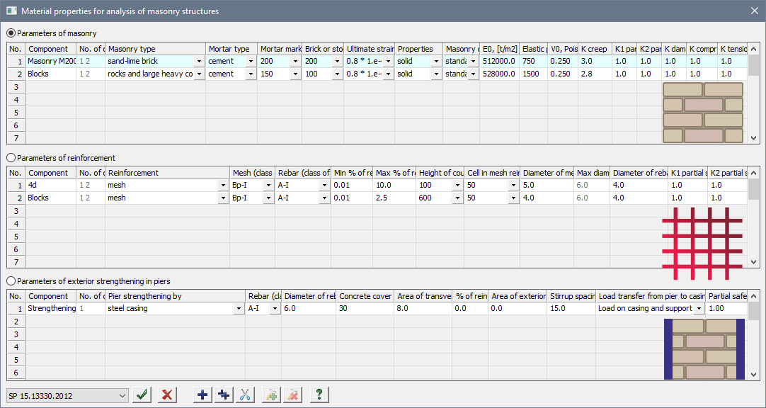 Materials are prepared and defined for design model in a similar way to the input data for analysis of steel and RC structures. Materials for analysis of masonry structures contain three components: properties of masonry, properties of reinforcement, and parameters of exterior strengthening of piers.