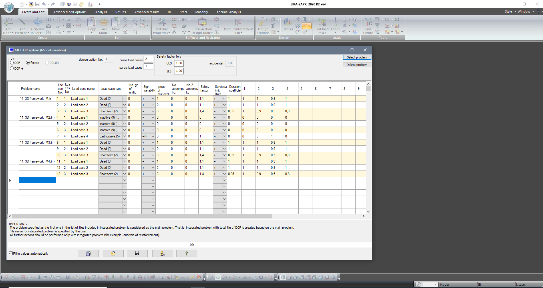 The system enables the user to merge problems with the same topology – nodal coordinates, FE model, geometry of sections. Problems may differ in load cases, stiffness and boundary conditions.