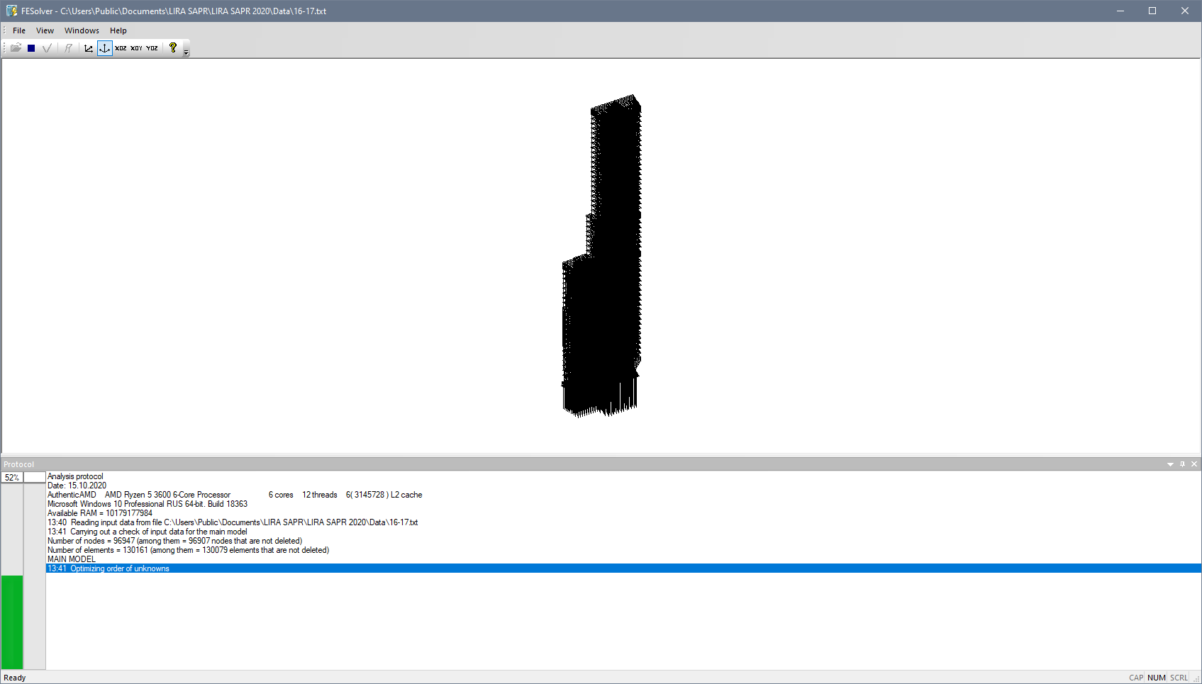 The finite element method (FEM) for displacements is realized. Finite element library includes more than 50 different types such as arbitrary bars, including elements on elastic foundation, triangular, rectangular and quadrilateral plate elements (wall-beam, shell, slab, including slab on elastic foundation); solids such as tetrahedron, parallelepiped, triangular and quadrangular prism, arbitrary convex hexagon and octagon; specific elements – spring of finite rigidity, joint compliance, out of contour element of soil foundation, etc.