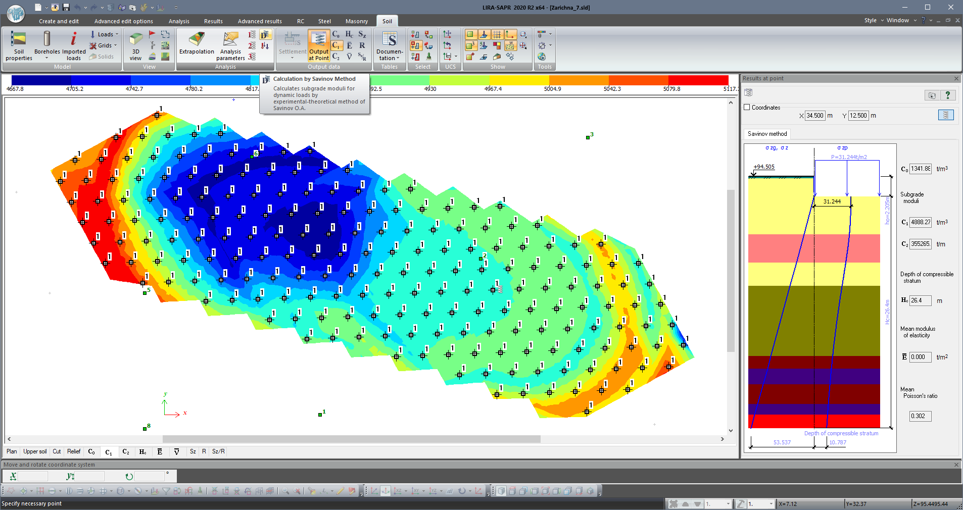 Based on specified geologic data (location and parameters of boreholes) the user will be able to generate 3D soil model. Modulus of subgrade reaction is determined according to this model across the whole slab area; this modulus depends on loads applied to foundation slab and loads from neighbouring structures. The depth of compressible stratum as well as settlement is also calculated.