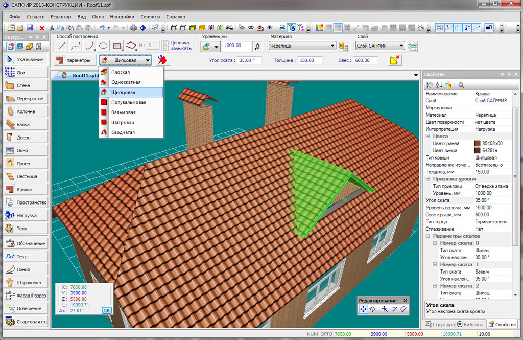 Several roof types may be generated dynamically: hip roof, half-hip roof, flat roof, shed roof, gable roof, helm roof or vaulted roof with account of pitch, overhang, structural thickness, snap level. Wall models can be trimmed up to roof pitches.