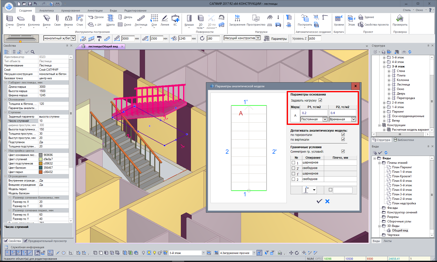 Stairs are generated automatically: both the physical and analytical model. Reinforced concrete staircases are modelled with plates, while staircases of cut stringers and closed stringers are modelled with bars of specified cross-section. The bearing elements of a staircase may be assigned dead and live load as well as support options at places where these elements intersect the building frame.