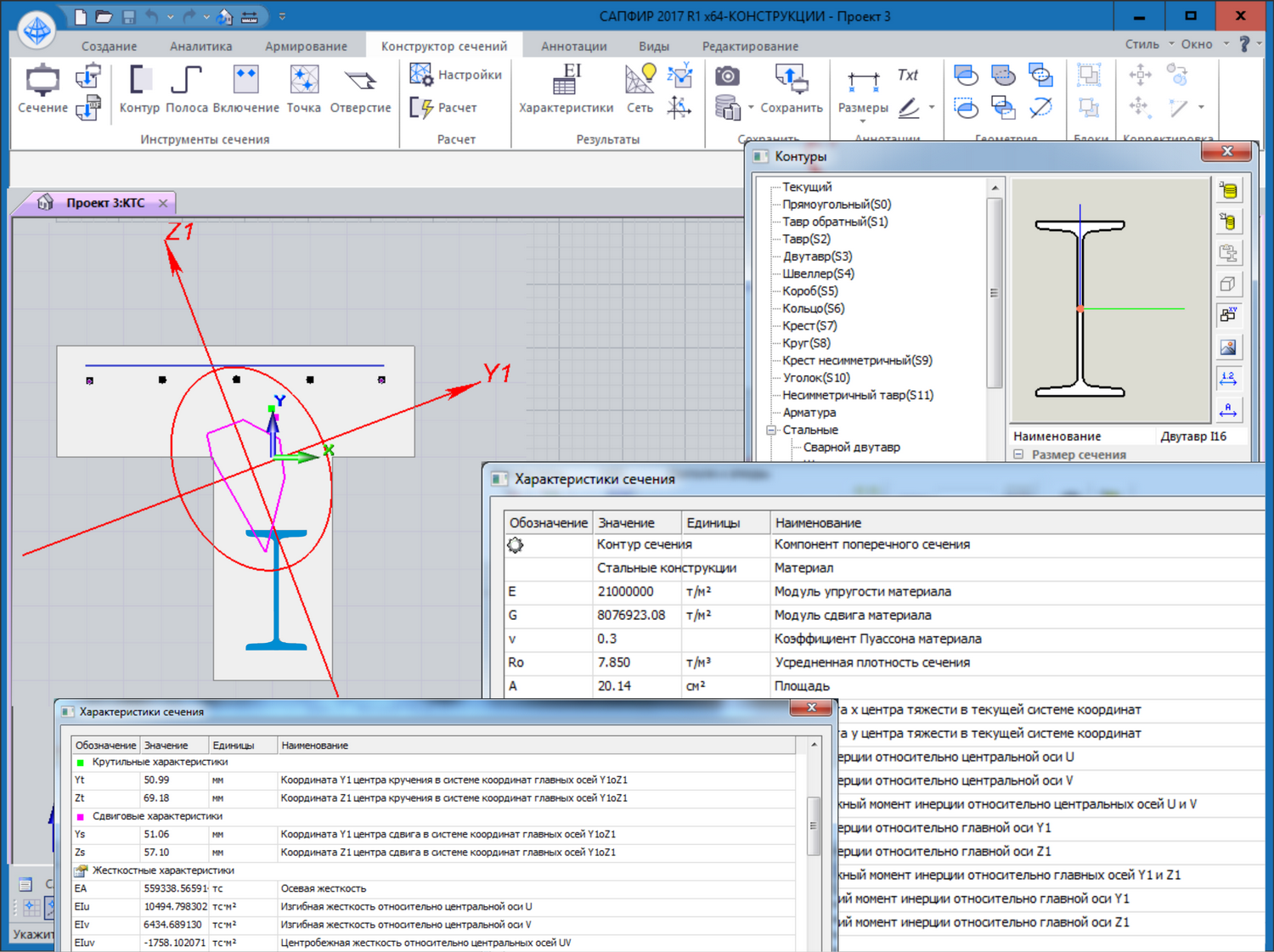 Stiffness parameters are calculated: bending, torsional, shear, warping, for mono and multi-material arbitrary sections. Sections may be solid, thin-walled and combined. The strip elements and rolled sections are taken into account. When forces on sections are defined, the stresses (normal, tangential, equivalent) in the section are calculated according to different criteria of strength.