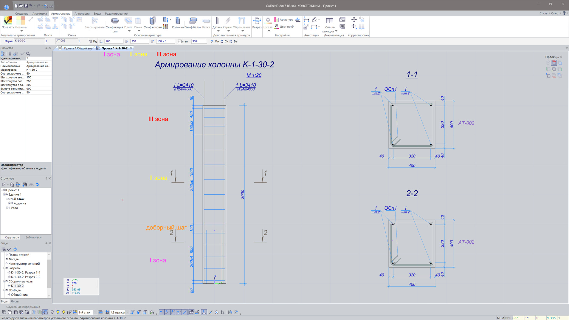 Analysis results for reinforcement may be imported from LIRA-FEM, contour plots and mosaic plots for reinforcement are visualized as underlay for the certain floor slab. Colour palette for reinforcement may be customized, it is possible to select main reinforcement. In this case, contour plots are updated automatically. The engineer could arrange zones of additional reinforcement over the contour plots.