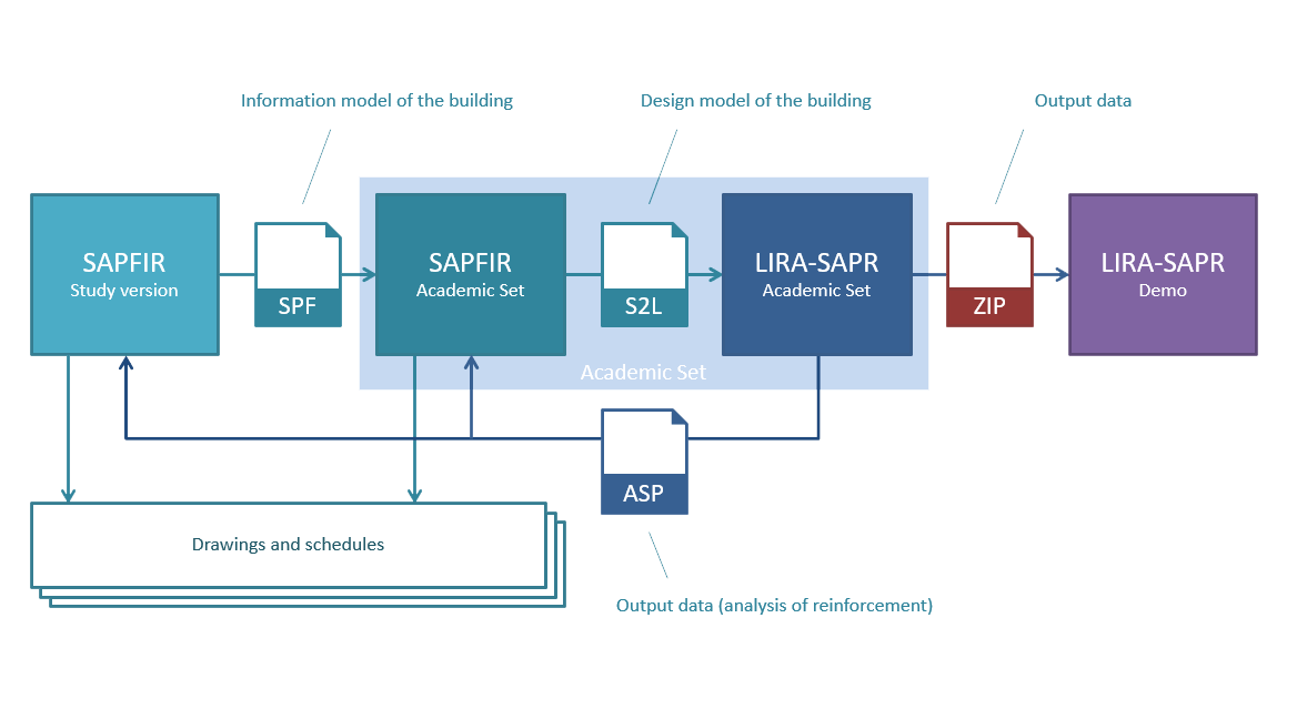 Demo version of LIRA-FEM contains LIRA-CAD module in Study version. Outside the classroom and without protection key, you could generate full design model (with specified loads applied as load cases, triangulation, etc.). Problem file generated in this version may be transferred to VISOR module of Academic Set version, then you will add parametric tables (DCF/dynamics/collection of masses) and carry out analysis. Then you could take home the saved input data (design model in *.lir format) and output data (including export of selected reinforcement for RC Design (LIRA-CAD) module), evaluate results in Demo version of LIRA-FEM, and generate drawings of reinforcement in RC Design (LIRA-CAD) module in Study version. That is, at home you could evaluate data, prepare output data and generate drawings of RC structures and RC structure items. Thus, time necessary to be spent in the classroom of the institution is reduced to min.