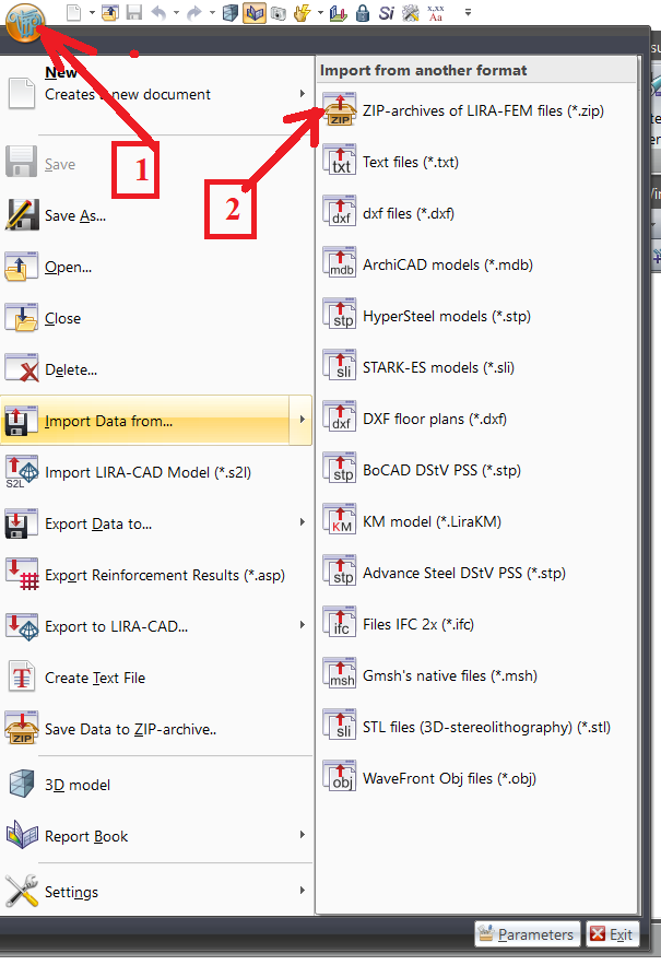 In the LIRA-FEM program, to create a ZIP archive that contains the project’s input data and a complete set of analysis results (output data), use the "Save problem to ZIP archive" command.