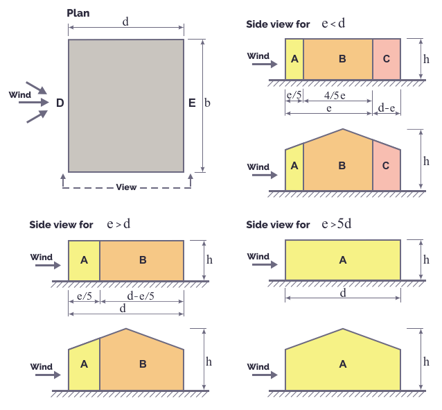 2. Pressure or suction in space: the load is divided into active and passive pressure zones, applied to the end walls and side walls of the building by zones A, B, and C, and on the roof. The user could define the number of ranges over the height of the building in the wind load attributes, modify the load shape, and choose ranges where constant pressure is applied.