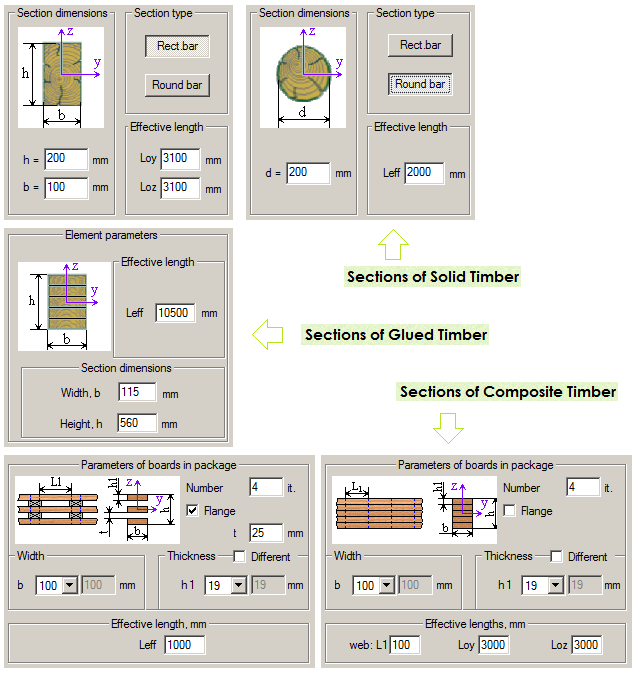 - Section type (solid, glued, composite). Each type of section has its own module for calculation: Solid sections of rectangular and round beams of timber structures; Glued sections of timber structures; Composite sections of timber structures.