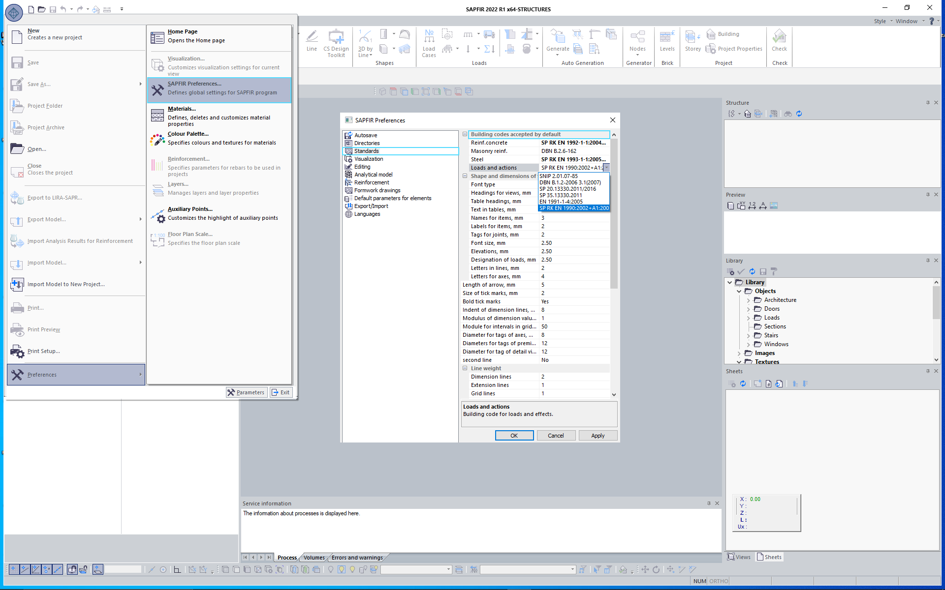 When you start working with the LIRA-CAD (SAPFIR) (LIRA-FEM preprocessor) (Fig. 1) or with the VISOR-SAPR module (LIRA-FEM FEM-editor) (Fig. 2), it is recommended that first of all you define a certain building code, i.e., the normative document that will be used by default. Then, all types of loads as well as coefficients and rules for their combination in analyses will be set in accordance with a certain building code.