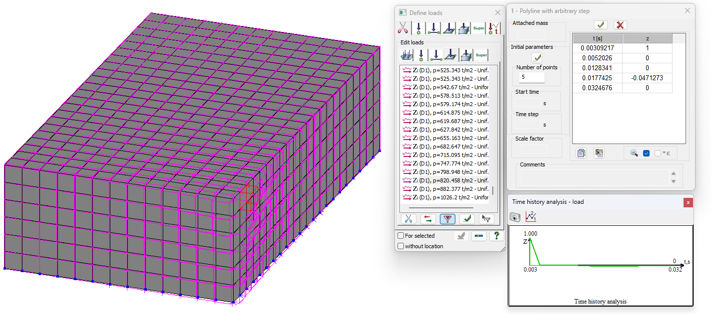 Modelling the process of dynamic loading on the basis of accelerograms with determination of forces and displacements in certain time intervals; the damping structures and material damping are considered.