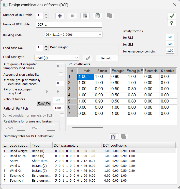 In LIRA-FEM problem, it is possible to specify several DCF tables and DCL tables. Multiple tables are required when it is necessary to calculate different structural elements with account of different responsibility factors, when it is necessary to perform comparative analysis of structures according to different building codes. Additional DCL tables may be generated to evaluate the deformation of design model, i.e. they are not used in the structural design.