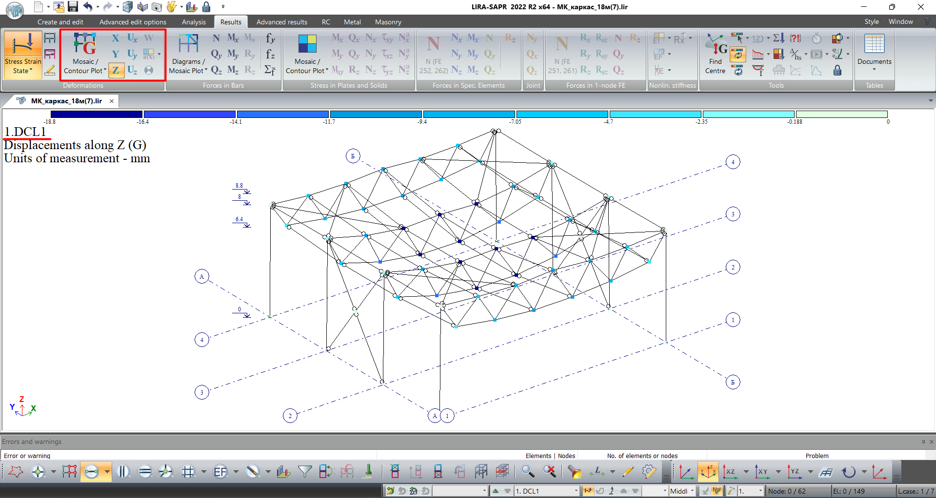 To evaluate the strain of the building structure and the displacements at nodes of the model, we carry out calculation by design combinations of loads (DCL).
