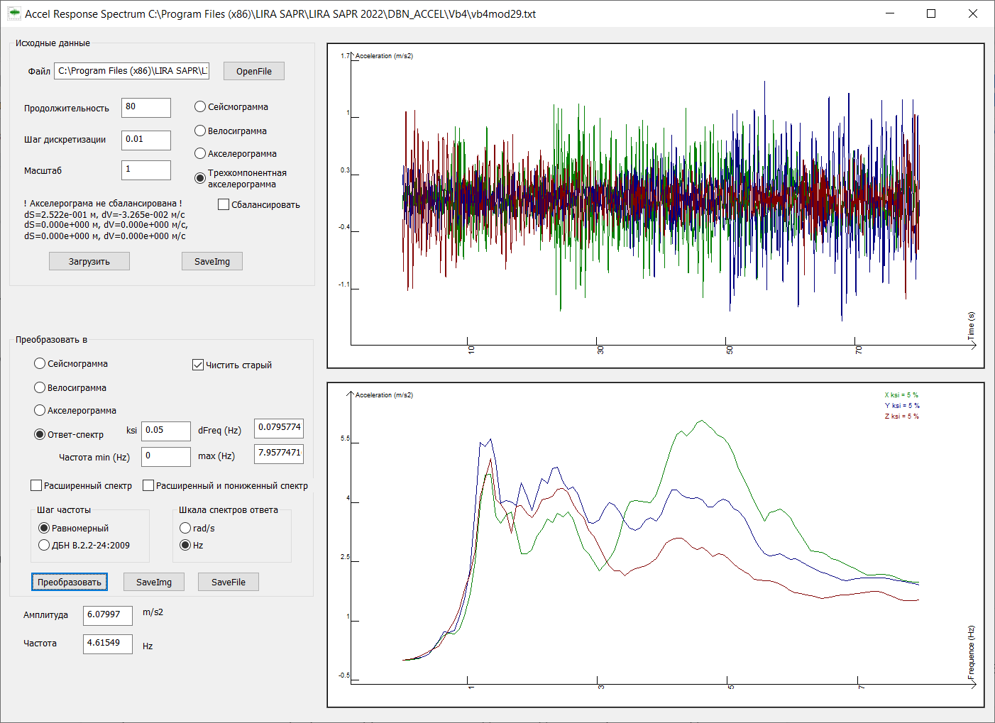 In the LIRA-FEM program, for spectral analysis, it is possible to set parameters that do not depend on building codes. The ReSpectrum system is mentioned to generate the response spectrum of a single-mass oscillator from dynamic loads defined by accelerograms, seismograms, velocigrams and three-component accelerograms, as well as for mutual transformation of these loads.