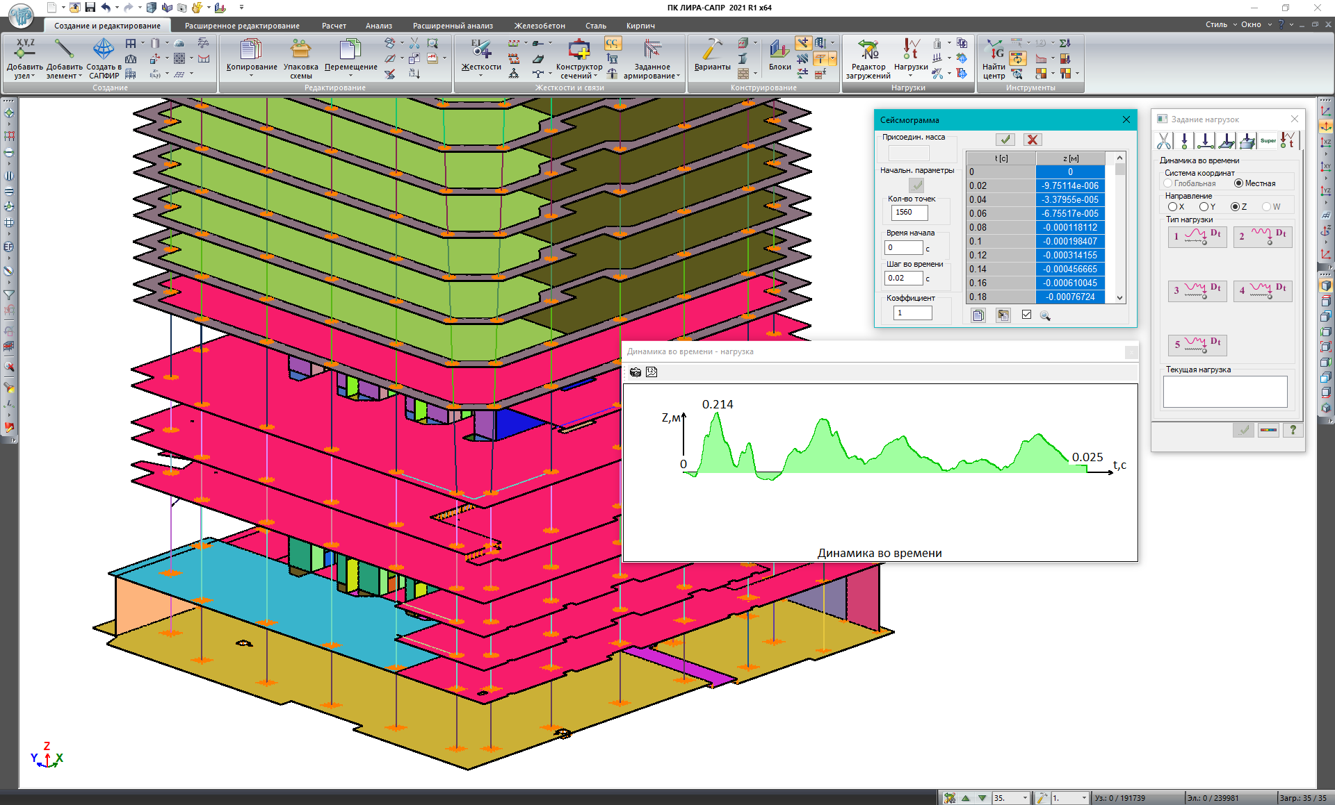 The modelling of the dynamic loading process on the basis of accelerograms, with the calculation of forces and displacements at certain time intervals, account for the influence of damping structures and material damping.
