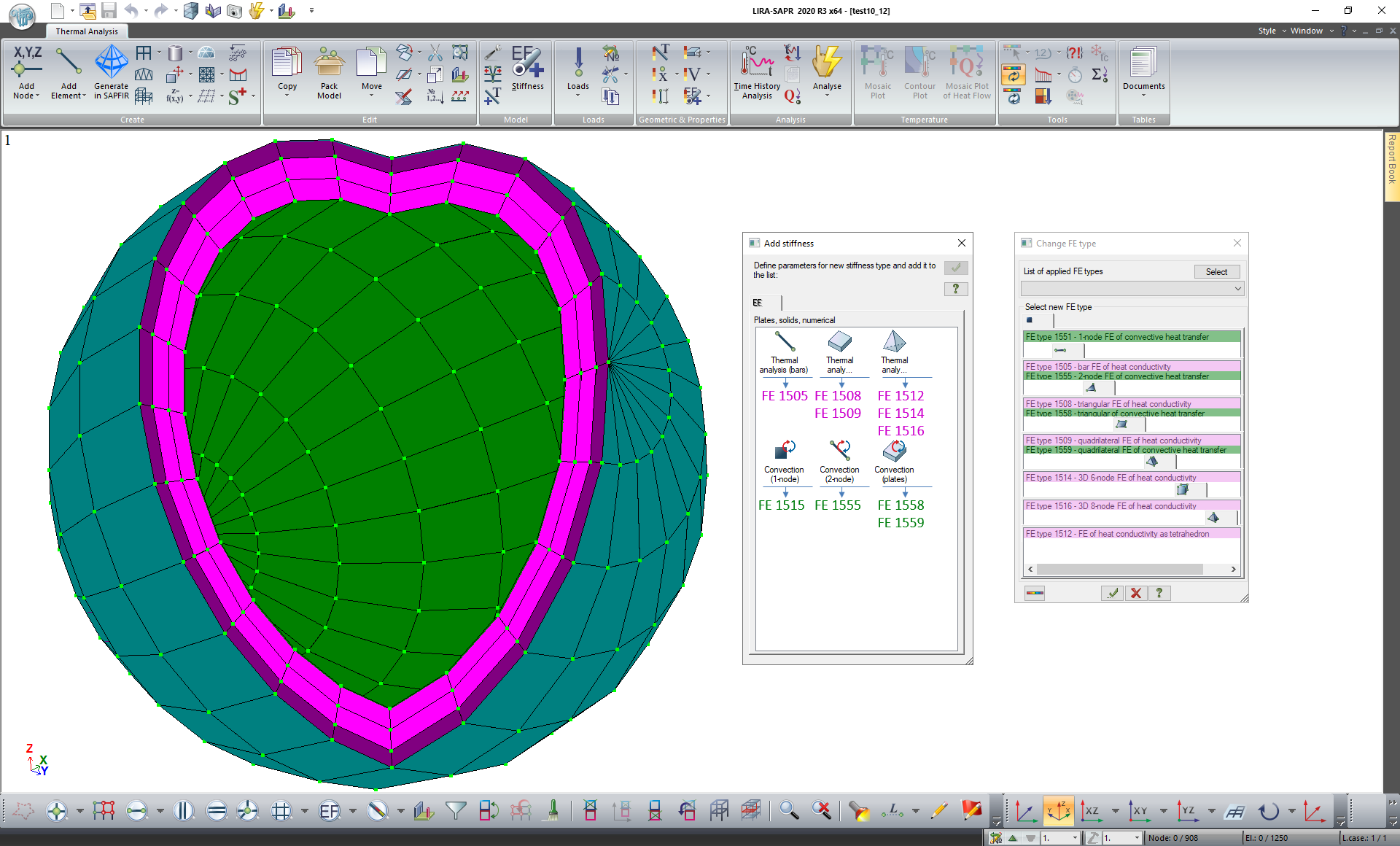 In the LIRA-FEM software, thermal analysis is carried out by the finite element method (similar to the strength analysis). For thermal analysis, LIRA-FEM implements one-dimensional, plane, and spatial FE of thermal conductivity. The contact between the surface and the medium is modelled using specific finite elements of convective heat transfer.